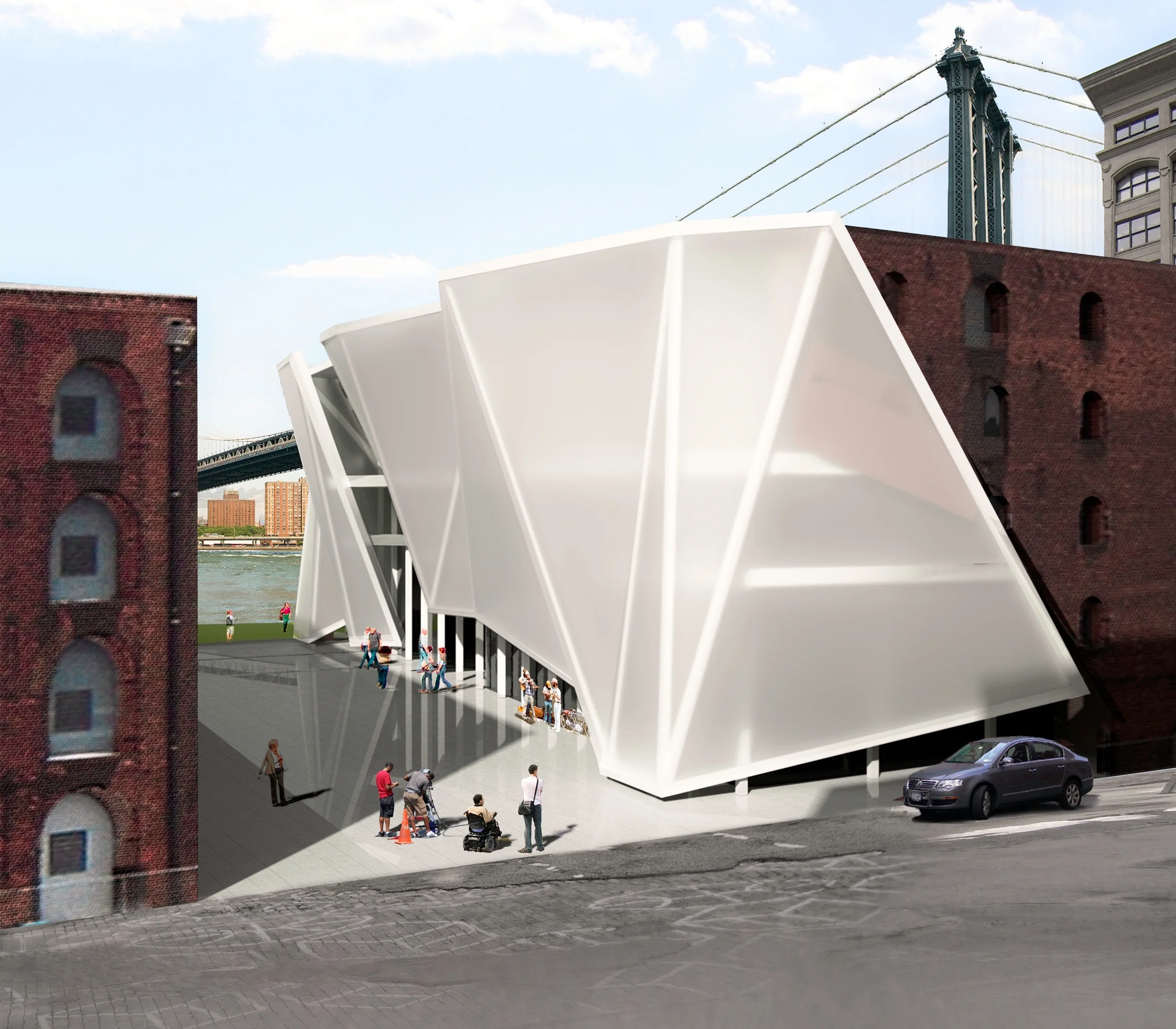 I began to be more interested in designing the process and incorporate time as an additional dimension. Two projects that use this thinking are the Film Center in Dumbo and a set of towers in downtown Warsaw. The Film Center uses one of its facades. It transforms from that facade to a screen for viewing films at night.
